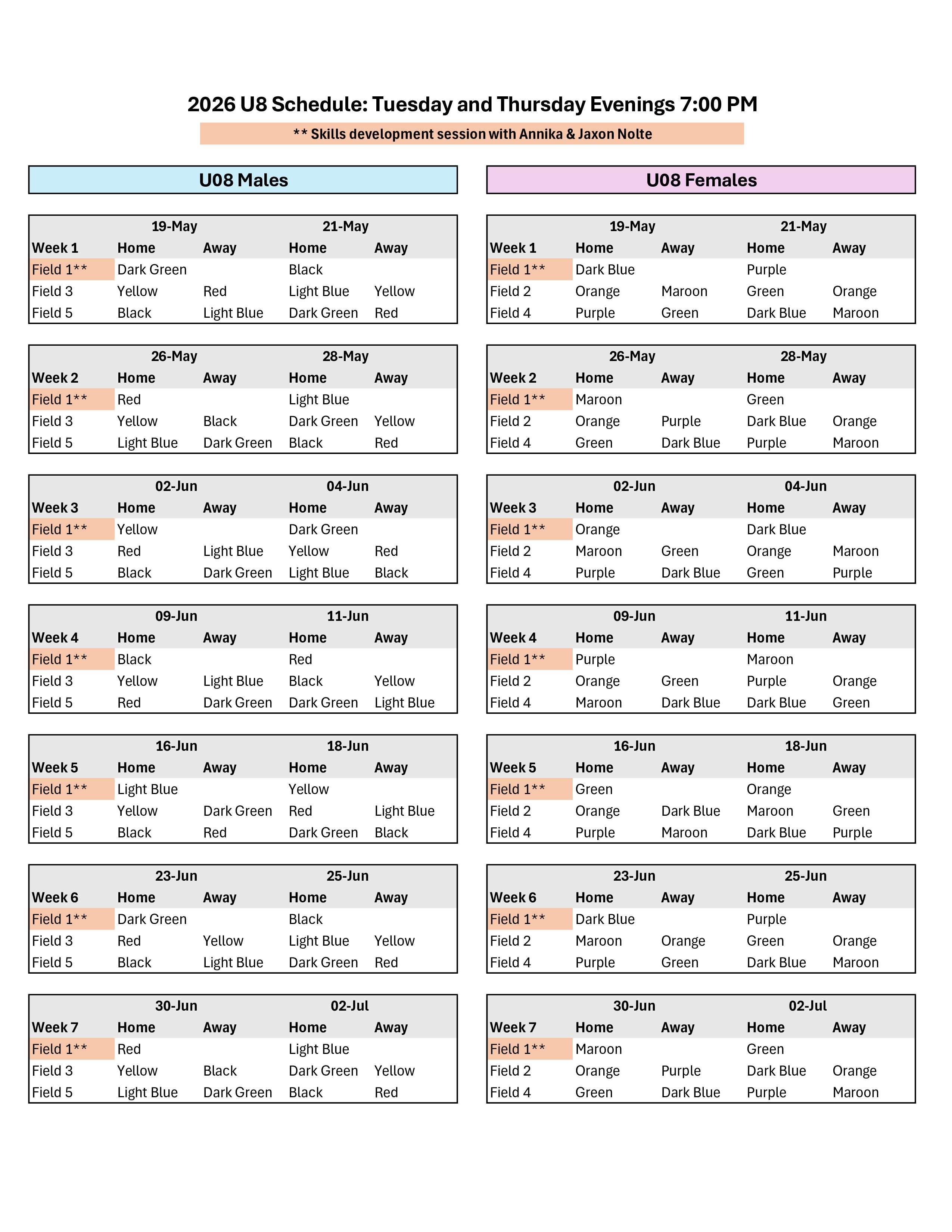 2026 Season: U8 Boys & Girls (birth years 2018 & 2019) play in separate divisions and will play on Tuesday and Thursday evenings from 7:00-8:00 PM on the fields behind Lord Dorchester Secondary School.